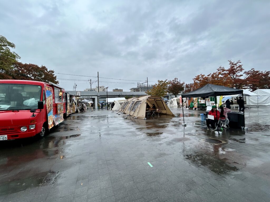 写真では人が少なく見えますが、実際はテントの中でトークイベントが行われていたり、机や椅子で食事を楽しんだりして賑わっていました。キッチンカーの前や本の展示テントも、常に来場者でにぎわっていて、雨でもイベントを楽しむ様子が感じられました。
