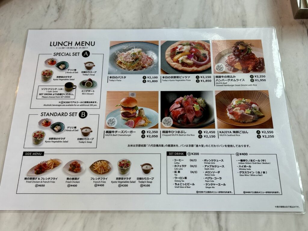 京都産ブランド野菜や自社牧場「梶屋牛」のお肉、パンは京都の老舗「進々堂」のものを使用するなど、細部までこだわりを感じます。