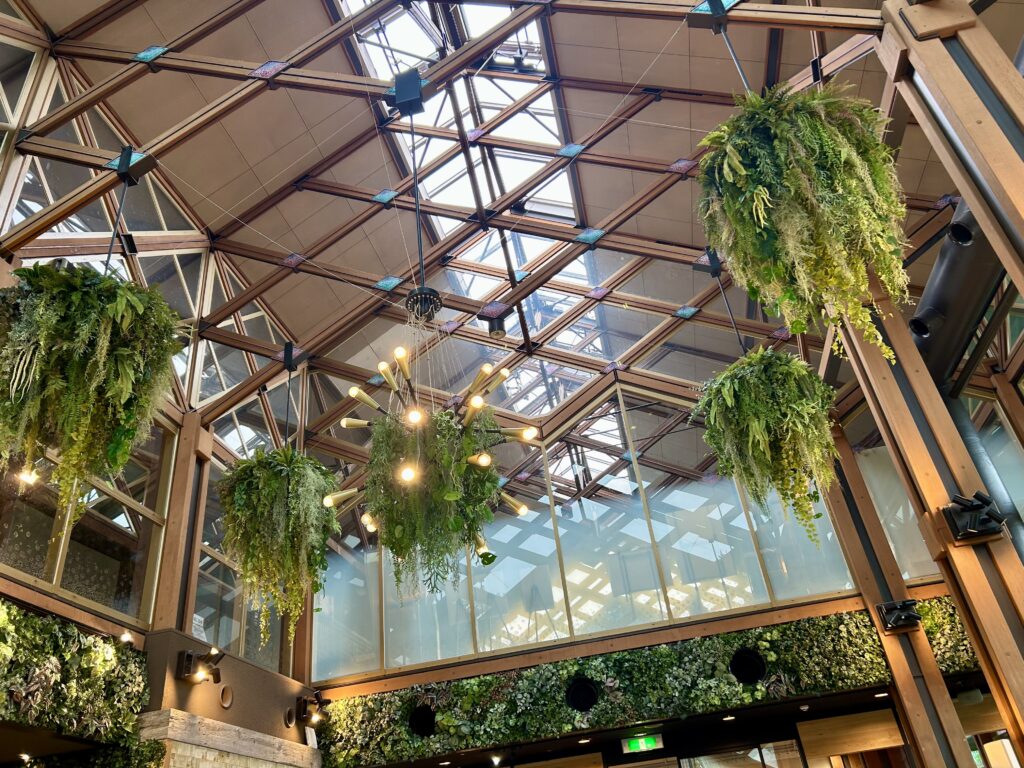 大きな窓から自然光が差し込み、店内は植物の装飾で落ち着いた雰囲気に包まれています。