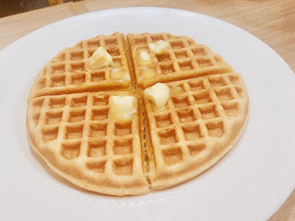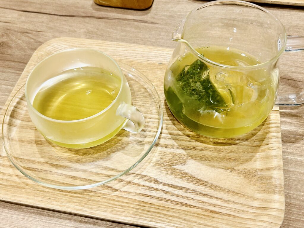 私は冷やし玉露と、プレーンワッフルを友達とシェアしました。玉露は澄んだ緑色で、すっきりした旨みと甘みが広がりとても上品。